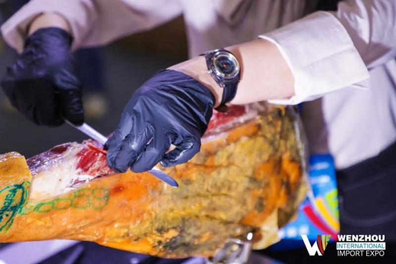 五、组织西班牙火腿推广活动。汇聚顶尖刀工,演绎火腿艺术,品味伊比利亚风情。“品火腿配红酒”成为进口消费的时尚潮流,进一步彰显瓯海国家进口示范区“火腿市场”的专业底蕴与非凡魅力。