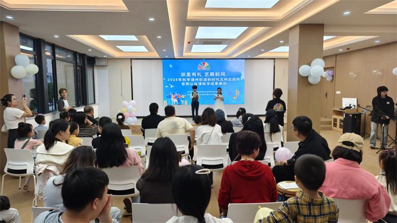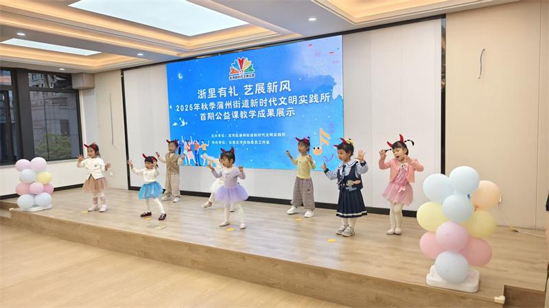 温州网讯 歌声、鼓声、朗诵声交织成温暖的旋律,上周末,龙湾蒲州街道新时代文明实践所“浙里有礼,艺展新风”教学成果展示活动圆满落幕。这场时长1小时的汇报演出,既集中检验了公益课程的教学成效,更让到场家长与孩子沉浸式感受文化艺术的独特魅力,让文明新风在互动中浸润人心。