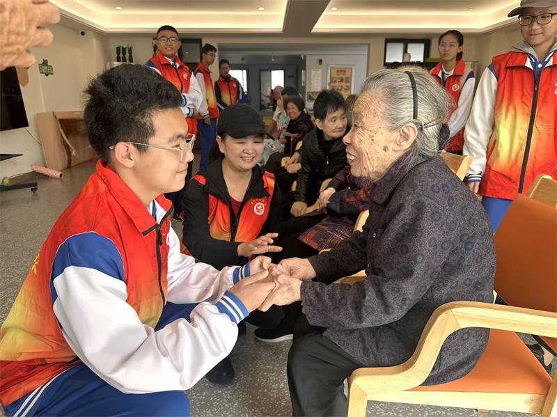 与此同时,龙水社区将公益实践与孝亲文化深度融合,组织青少年志愿者走进亲和雅园养老机构,开展“青春伴夕阳”主题活动。在工作人员的引导下,志愿者们分组行动:“聊天组”用方言与老人亲切交流,倾听岁月故事;“游戏组”带来纸杯传递、扭扭棒手工等互动游戏,现场笑语不断;“分餐组”则化身贴心服务员,悉心照料老人用餐。一幕幕温馨画面,勾勒出“老吾老以及人之老”的生动图景。