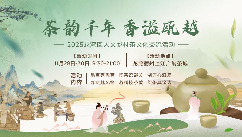温州网讯(记者 张如如)这里的茶香,即将混搭“元宇宙”的科技感!下个周末(11月28日至30日),龙湾蒲州上江广纳茶叶批发中心将变身大型文化打卡现场——以“茶韵千年 香溢瓯越”为主题的2025龙湾区人文乡村茶文化交流活动即将开幕。这不仅仅是一场茶的盛宴,更是一次穿越古今、虚实交织的沉浸式文化探险。