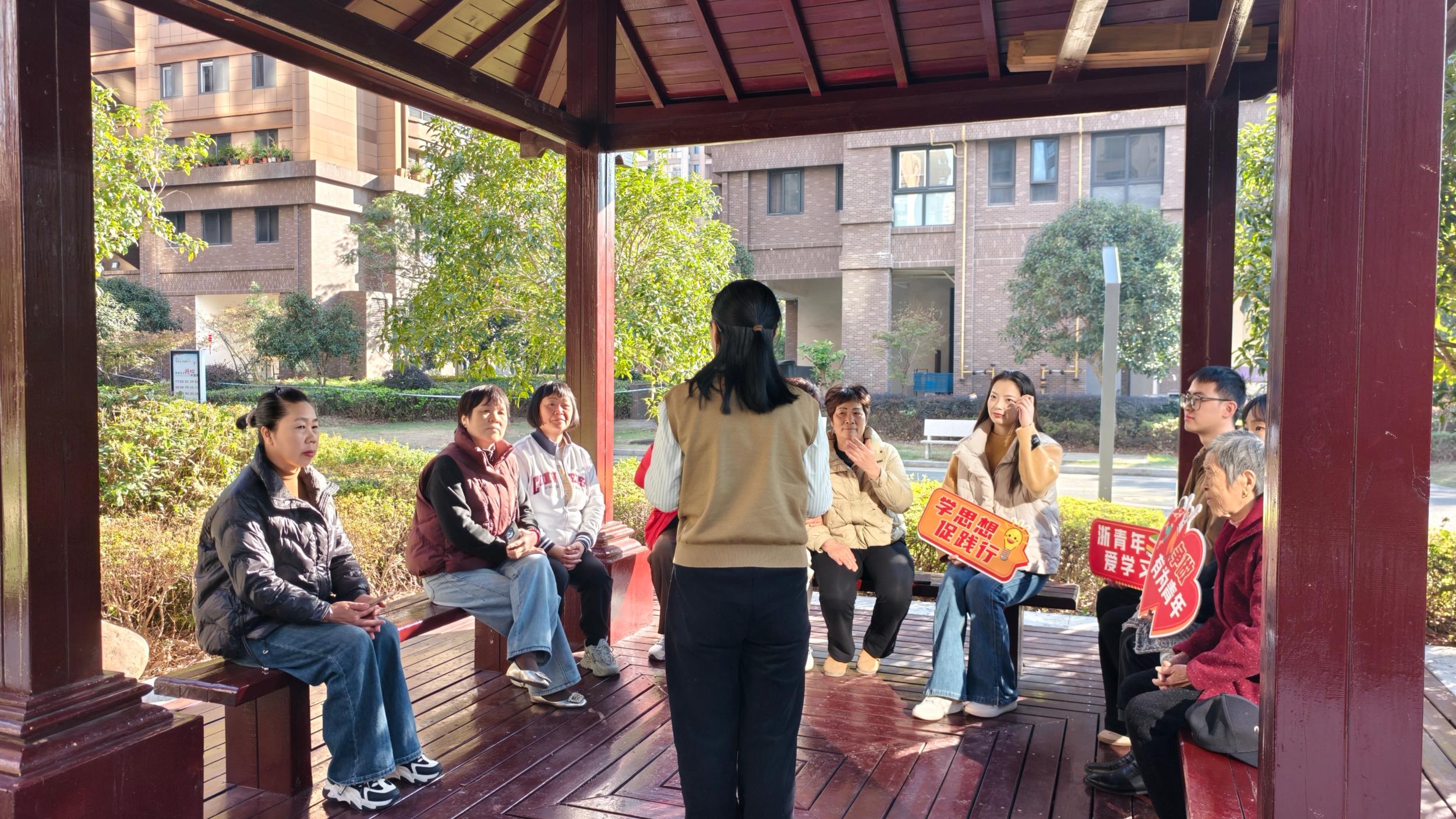 从社区邻里到亭台闲话,宣讲的脚步从未停歇,最后一站定格在状元街道的慈善地标——状元亭。古色古香的亭台间,几位老人正悠闲休憩,龙跃社区社工郑丰丰缓步走近,笑着加入他们的圈子,以“共建温暖家园”为主题,解读二十届四中全会关于基层治理与文化繁荣的要求。
