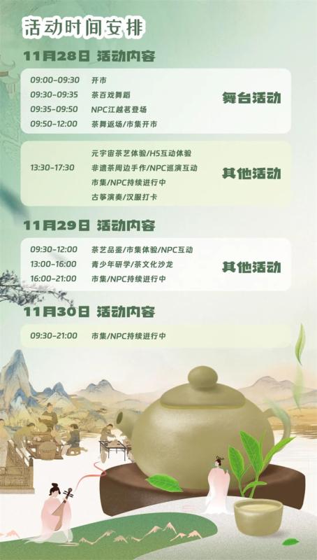 除了核心的元宇宙体验,活动还设置了多元配套环节。在“传薪阁”,可亲手制作漆扇、为茶具拓印描金,感受非遗匠心;在“和市集”里,特色茶品与创意文创琳琅满目,满足品鉴与收藏需求。古风NPC“江越茗”随机空降现场,诗词暗号互动可解锁限定礼品,每日更新的非遗茶艺表演、汉服茶会、民乐演奏等节目,让三天活动精彩纷呈。