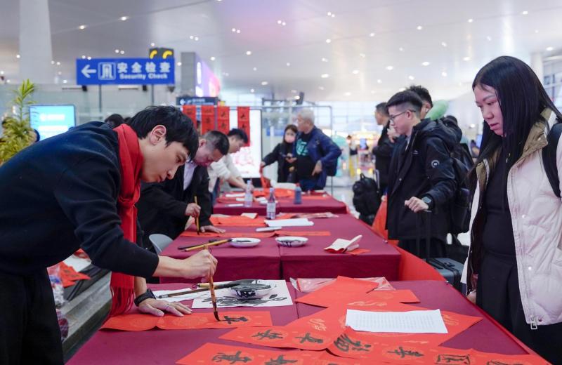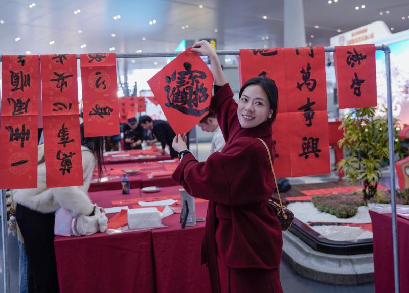 15时30分起,“民俗文化角”的春联书写、“温暖留影区”的即时拍照便已开始暖场,让候机时光变得丰富有趣。晚会期间穿插的“年味知多少”有奖问答,吸引驻足观看的旅客踊跃参与,乡音在抢答与欢笑声中交织。这些触手可及的互动,让航站楼在那一刻不只是交通枢纽,更像一个充满人情味的“旅途客厅”。