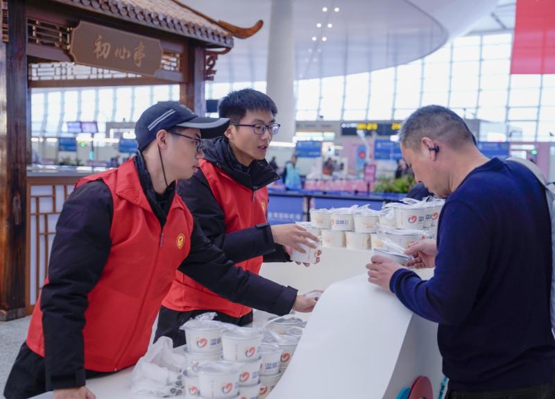 晚会尾声,最暖人心的环节悄然展开。机场领导与党员初心站志愿者一同走进值机、安检区域,为旅客和坚守一线的员工送上热气腾腾的饺子,配上一句“新年快乐,一路平安”。前往广州的旅客张女士感动道:“没想到在机场还能吃上除夕一样的水饺,心里特别暖。”