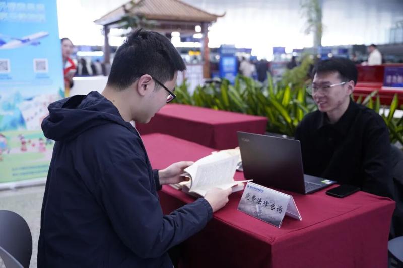 线下,机场在T2航站楼出发厅中轴区域设置主题宣传展台,由服务部联合团委牵头,审计部及至臻、彩虹、悦翼等一线服务班组,以及贵宾公司瓯悦、欣悦班组共同参与,围绕《中华人民共和国民用航空法》解读、特殊旅客服务、首乘旅客引导、入境中转便利化、中转四免服务、充电宝寄存服务等旅客关注热点,开展现场咨询答疑,面对面帮助提升旅客维权意识,倡导安全文明乘机的出行理念。