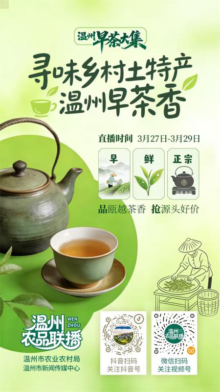 温州网讯 春日瓯越,茶香四溢。五马街的温州早茶大集直播专场迎来第二天,这场以“寻味乡村土特产·温州早茶香”为主题的直播,打破传统早茶的单一体验,将千年瓯越茶文化与新潮消费需求融合,带来多款经典好茶、非遗文创茶礼与创新茶食,从自饮解馋到送礼体面,全方位解锁春日茶香新玩法。