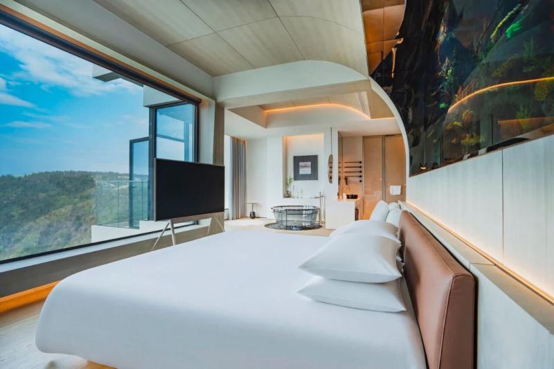 走进度假区云上会客厅,空气中弥漫着咖啡的醇香。这里依托高差360米的悬崖峭壁而建,巨大的落地窗外,是层峦叠嶂的远山和波光粼粼的湖面。优美的景色吸引了众多游客过来打卡。有的驻足窗边,手捧咖啡远眺飞云湖;有的围坐畅聊,享受静谧惬意;还有的以湖光山色为背景,拍照留影。