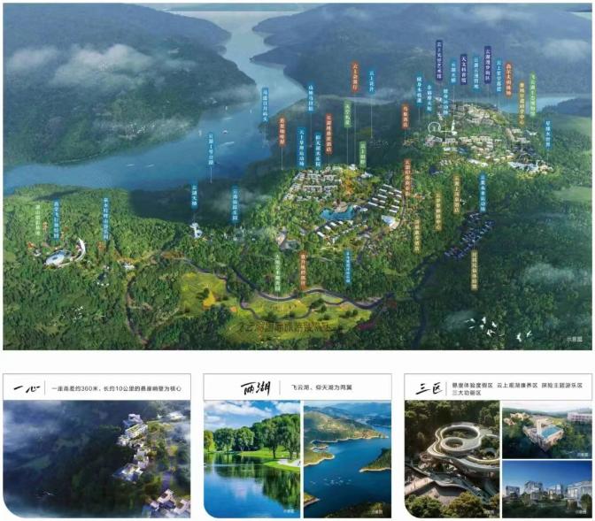 据了解,飞云湖国际旅游度假区项目分三期建设,总投资20亿元,占地面积超2000亩,整体规划为“一心两湖三区”,即以一座高差360米的10公里长的悬崖峭壁为核心,飞云湖、仰天湖为两翼,串联悬崖体验度假区、云上观湖康养区、探险主题游乐区的三大功能区。规划建设悬崖乐园、森林探险乐园、山湖亲子奇趣园、隐逸云湖园等四个乐园,森林步道、山地骑行路、星空露营基地、国际少儿运动营、湖岸景观线等五大文体运动中心,近百个子项目,打造“云、山、湖、天、林”融为一体的沉浸式康养度假综合体。
