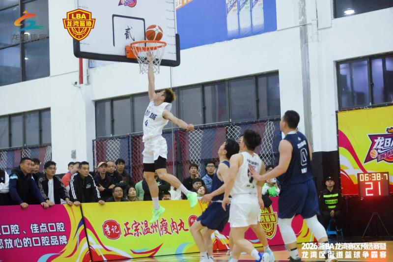 温州网讯 4月3日晚,龙湾区欧通体创园暨永阜村文体中心内灯火通明,呐喊声、鼓掌声此起彼伏。2026浙BA龙湾赛区选拔赛首场比赛在这里打响——沙城街道对阵蒲州街道,比分交替紧咬,一记利落上篮引爆全场,热血与活力扑面而来。